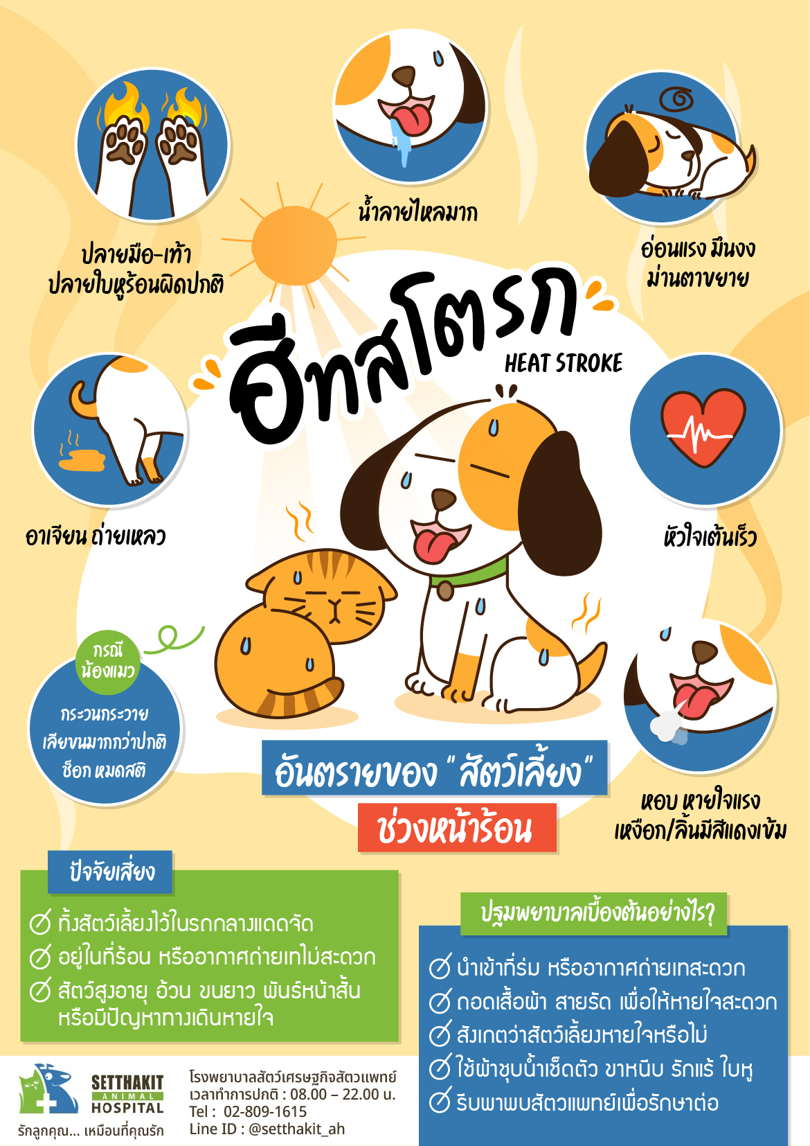 หากสังเกตว่าสัตว์เลี้ยงของเรามีอาการเข้าข่าย 1 ใน 9 ข้อนี้ อาจจะเริ่มมีอาการของฮีทสโตรกแล้ว ควรรีบปฐมพยาบาลสัตว์เลี้ยงเบื้องต้น ก่อนนำส่งสัตวแพทย์ใกล้บ้านทันที อย่าปล่อยไว้นานเกินไป เพราะไม่อย่างนั้น อาจอันตรายถึงชีวิตสัตว์เลี้ยงได้